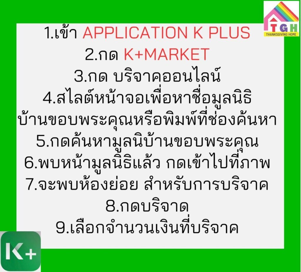เพียงดาวน์โหลด Application K PLUS และเข้าไปที่ เมนู K+ Market => บริจาคเงินออนไลน์ => ค้นหา => มูลนิธิบ้านขอบพระคุณ=>เลือกประเภทเงิน =>กดเงินบริจาค สามารถคลิกเพื่อบริจาคเงินออนไลน์ สะดวก รวดเร็ว สำหรับทุกท่านในการใช้บริการ Application K PLUS เป็นแพลตฟอร์มที่ให้มากกว่าบริการทางการเงิน สำหรับออนไลน์ไลฟ์สไตล์ ใช้ง่าย ปลอดภัย พร้อมให้บริการท่าน สามารถเปิด K-eSavings ผ่านแอปได้ด้วยตัวเอง หรือเข้าใช้งาน K PLUS Lobby ได้แม้ไม่มีบัญชีหรือบัตรธนาคารกสิกรไทย